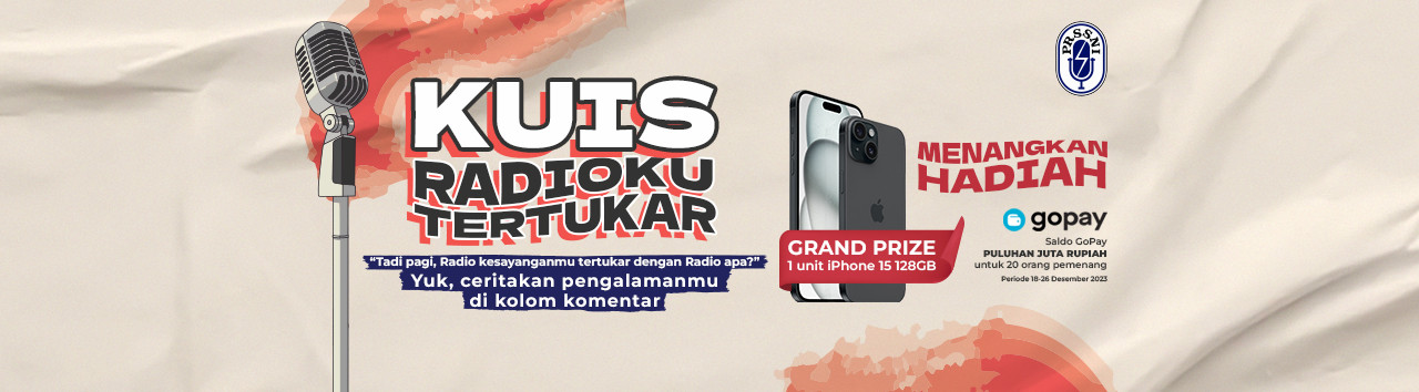 Rayakan HUT Ke-49 PRSSNI dengan ikutan Kuis “Radio Tertukar”! Ceritakan pengalamanmu saat Radio favorit kamu tertukar dengan Radio lainnya di kolom komentar Instagram @prssni_radio_indonesia_ dan menangkan hadiah seru: 1 unit iPhone 15 128GB dan saldo GoPay puluhan juta rupiah untuk 20 pemenang.